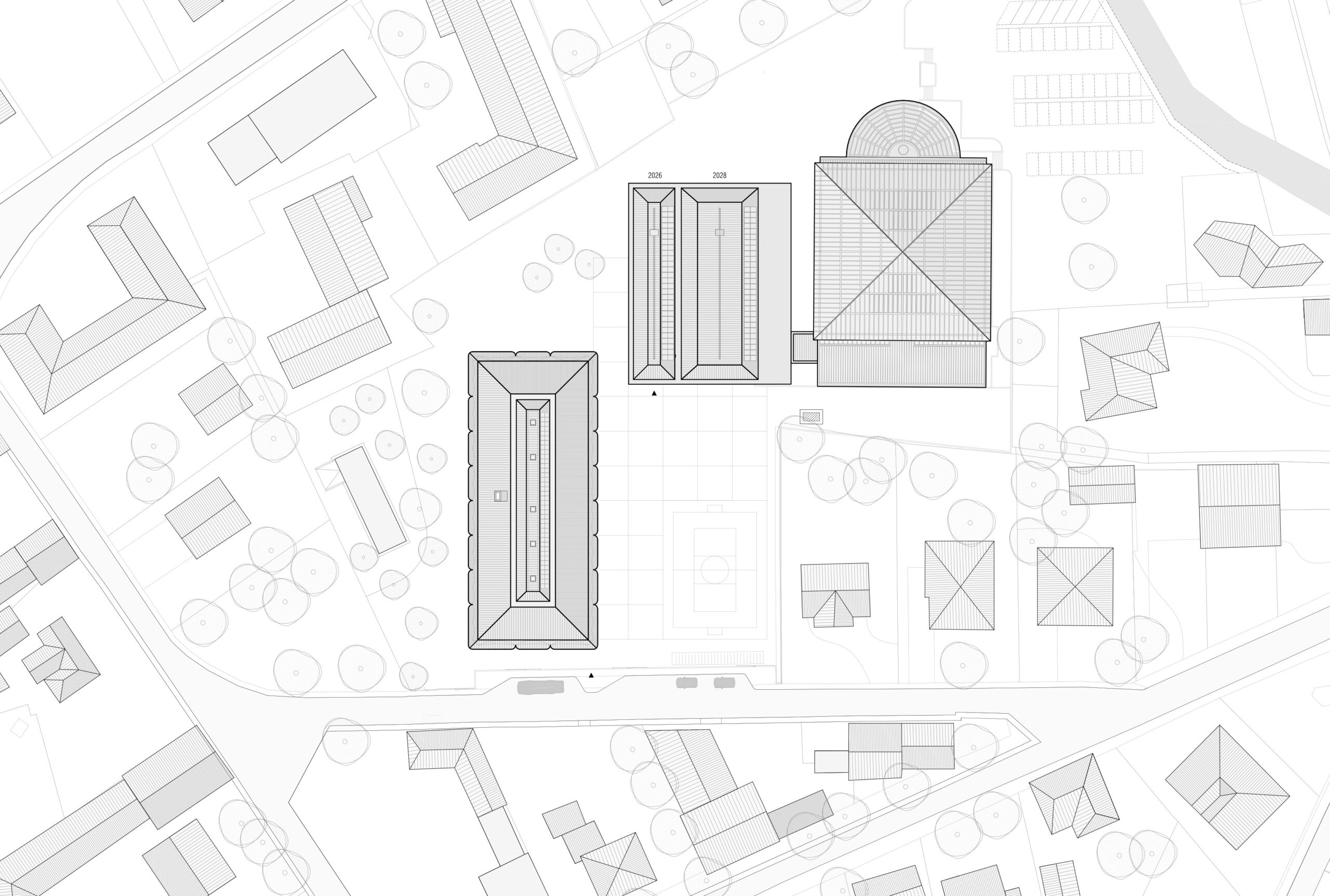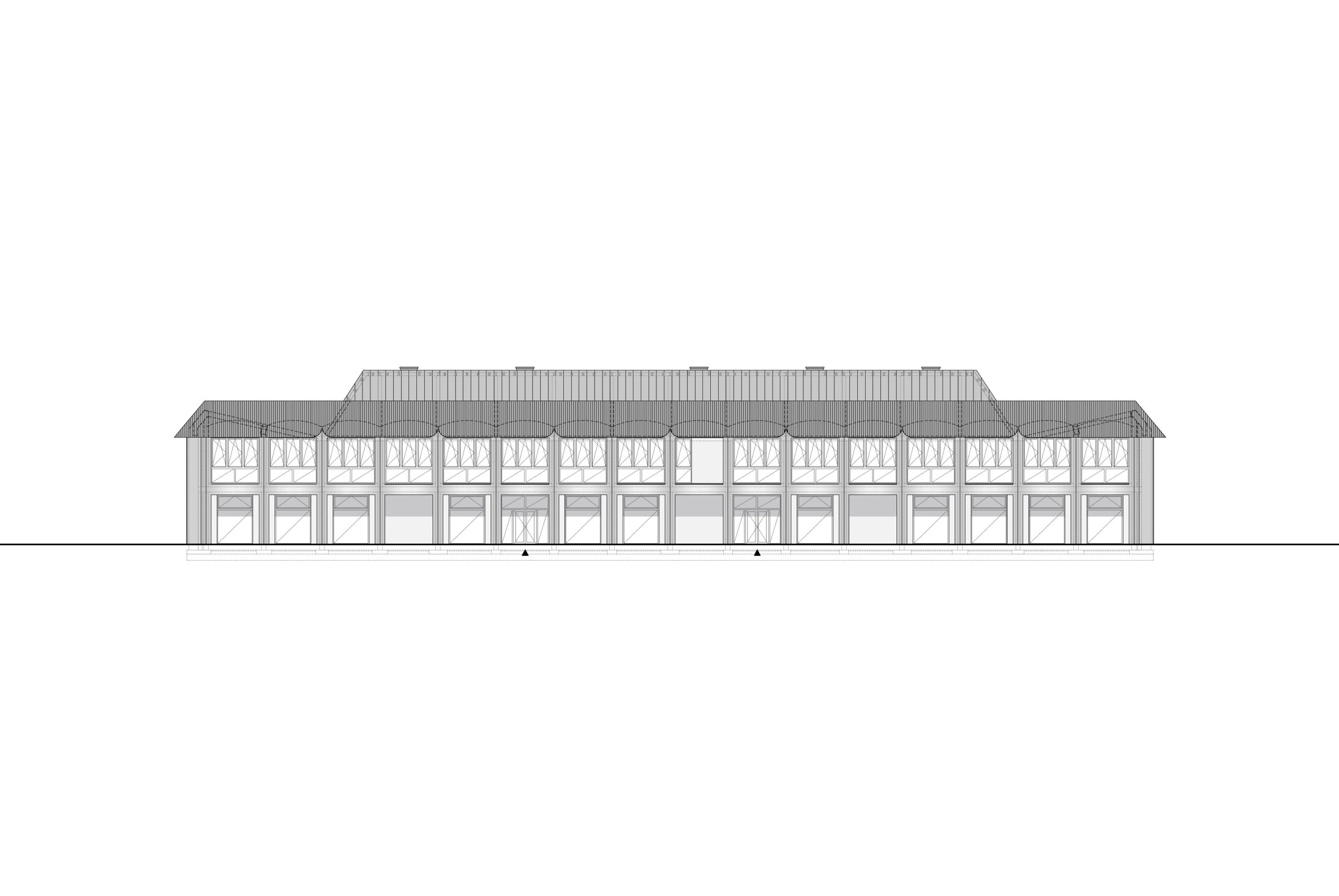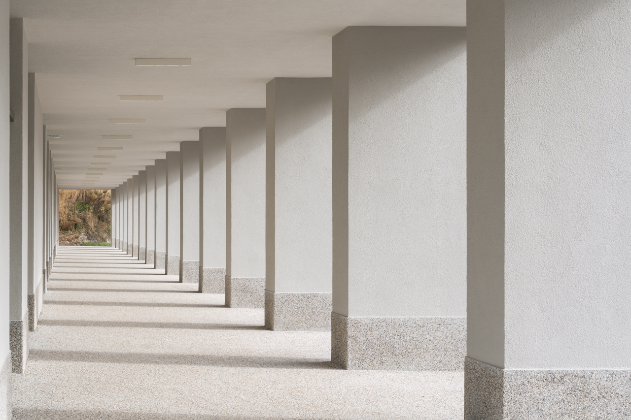 From an architectural perspective, the building draws inspiration from the Palladian Basilica, seeking harmony and rhythmic order through a rigorous 3.75-meter structural grid. This regularity, which reflects the dimensions of the classrooms, is reinterpreted through a sculpted, undulating facade that modulates natural light to create deep chiaroscuro effects. A deep portico at ground level serves as a sheltered threshold and connects the two independent school entrances, mediating the transition between the school grounds and the newly formed public square.