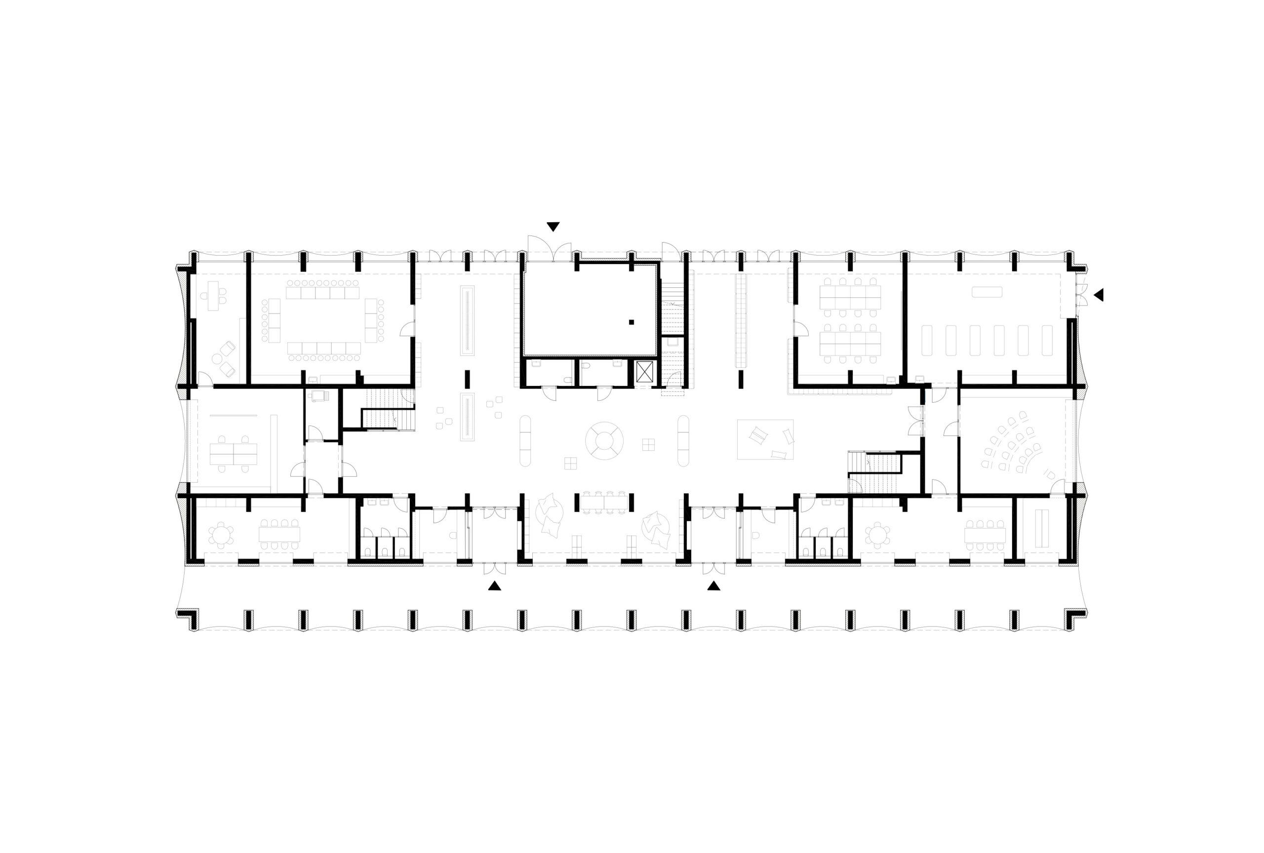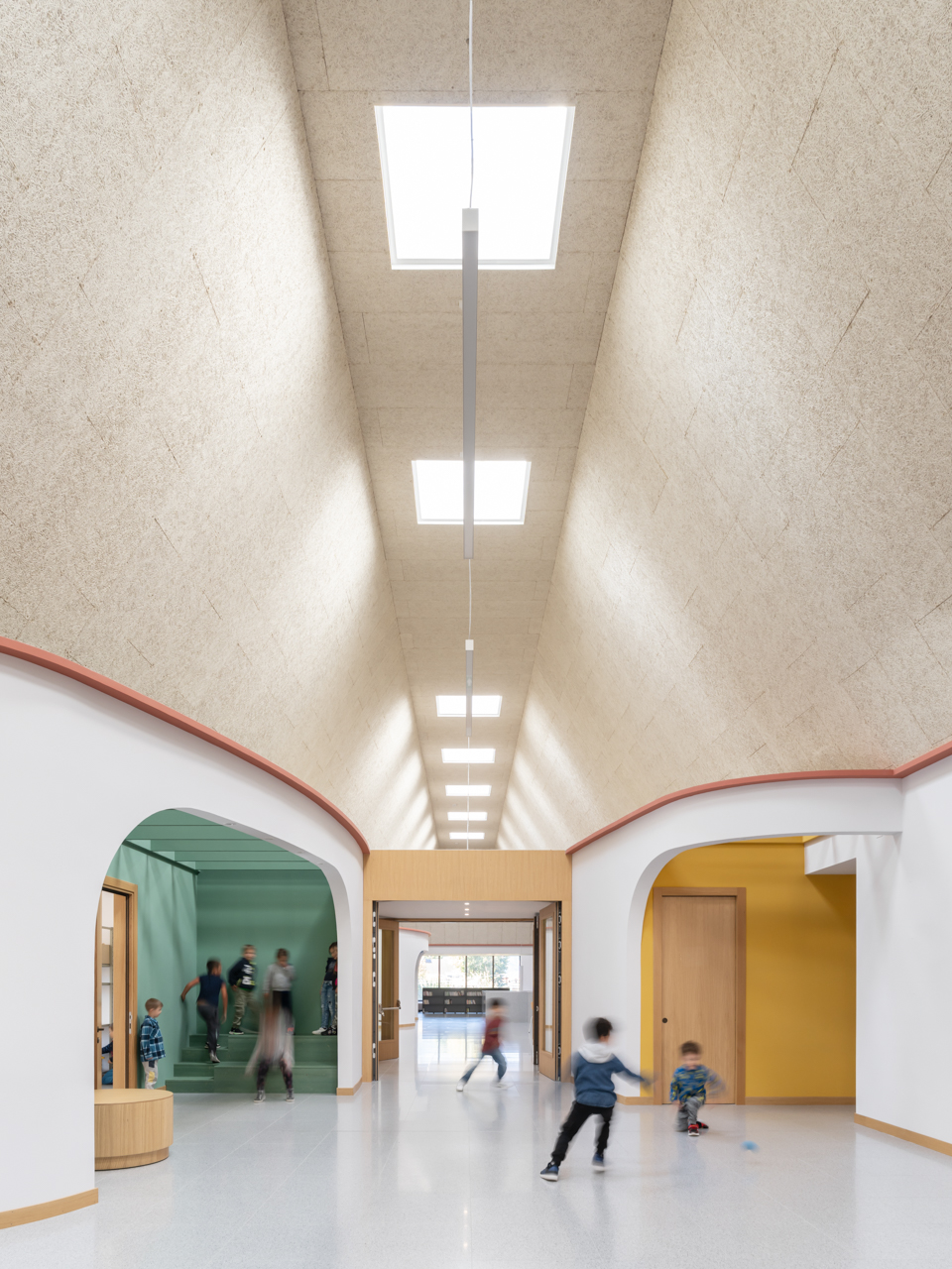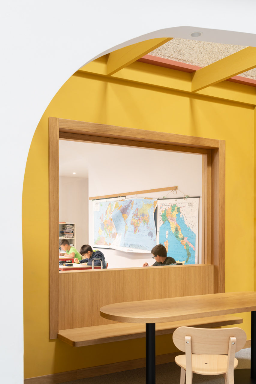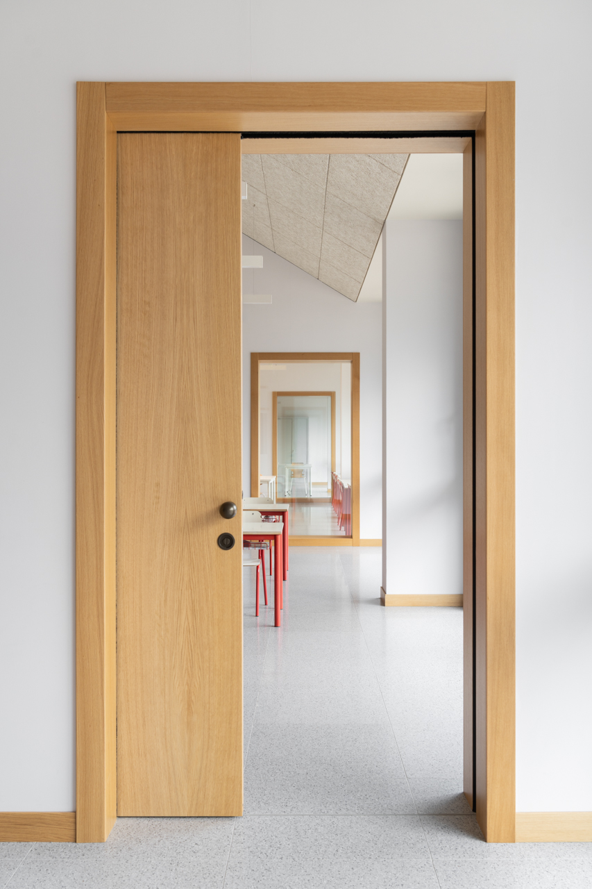 Inside, the spatial organization follows a mirrored symmetry that keeps the educational paths separate while fostering social interaction in a central polyvalent core dedicated to informal learning. While administrative offices and laboratories occupy the ground floor, the primary educational spaces are elevated to the “piano nobile.” Here, a monumental hall illuminated by square skylights serves as the building’s spine, culminating in learning “living rooms” with large windows that project views toward the surrounding landscape.