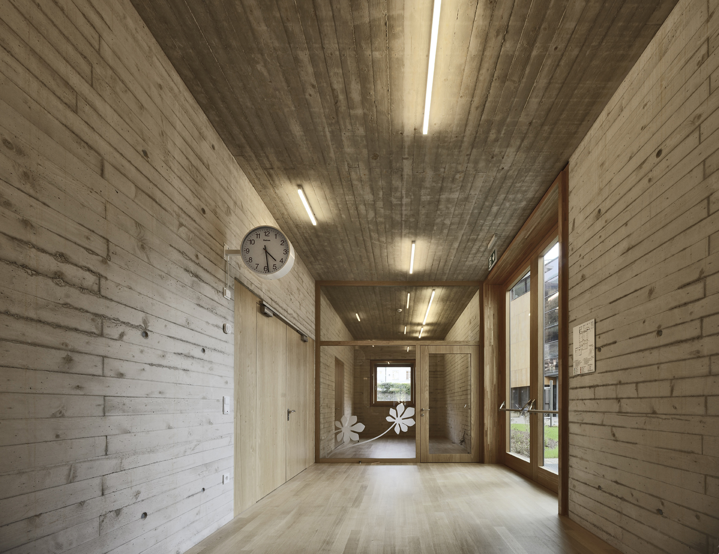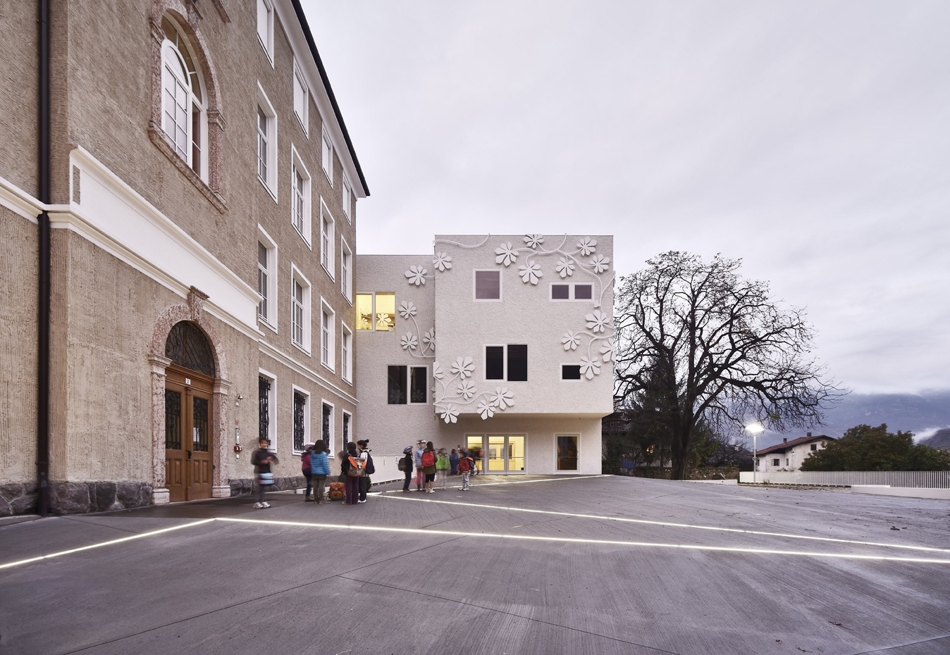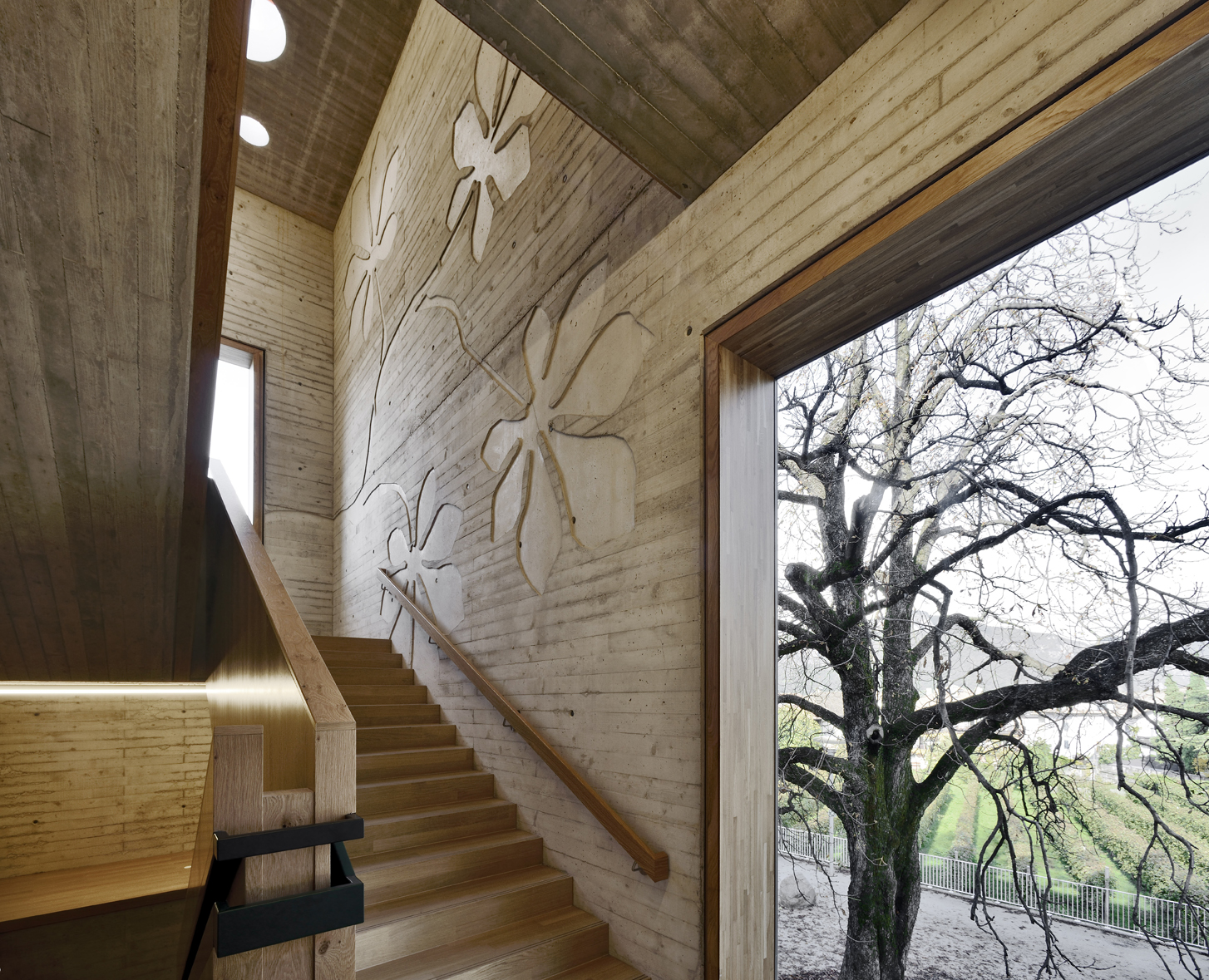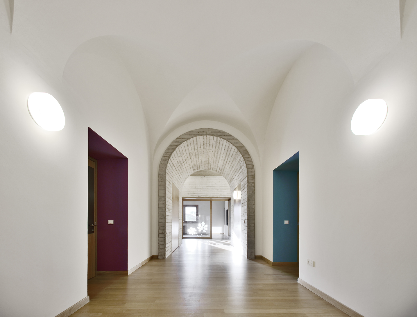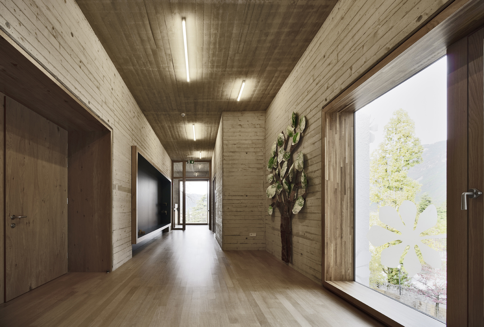 The project integrates the historical building with two new white volumes that frame a centennial chestnut tree, whose natural silhouette is imprinted on both the facades and the interior concrete walls. A fluid, zigzagging corridor connects the three structures, separating the common services on the lower floors from the educational spaces on the upper levels.