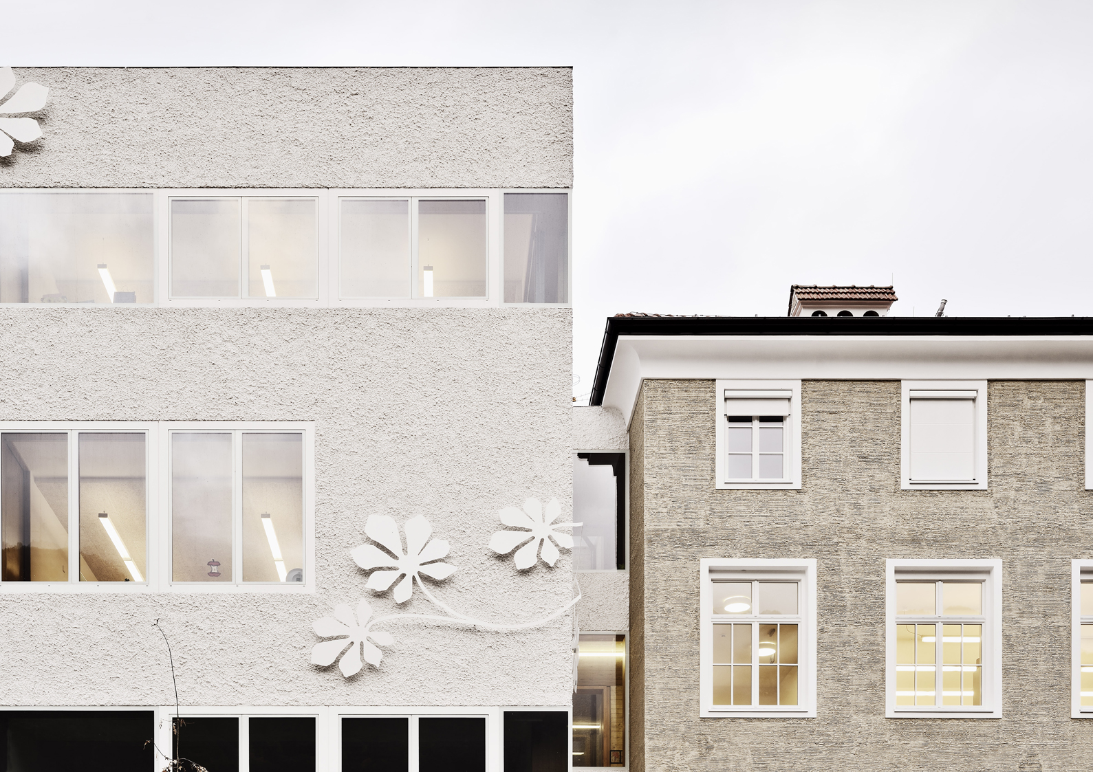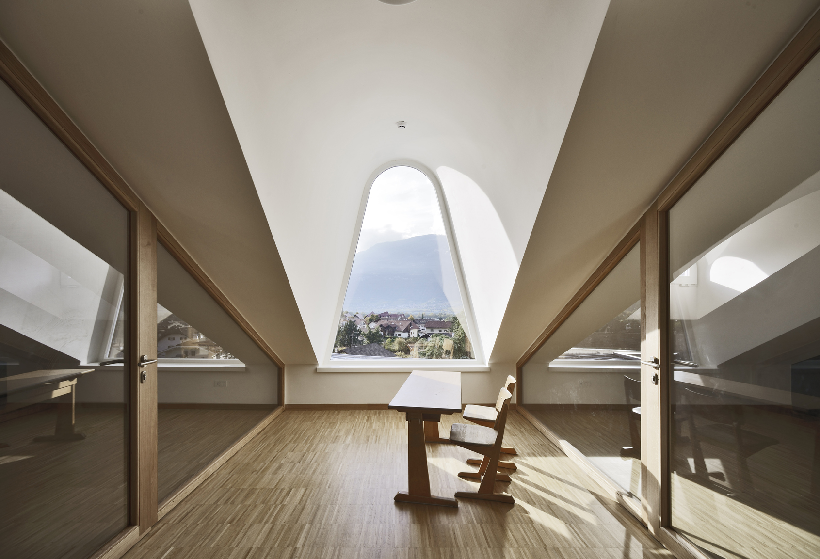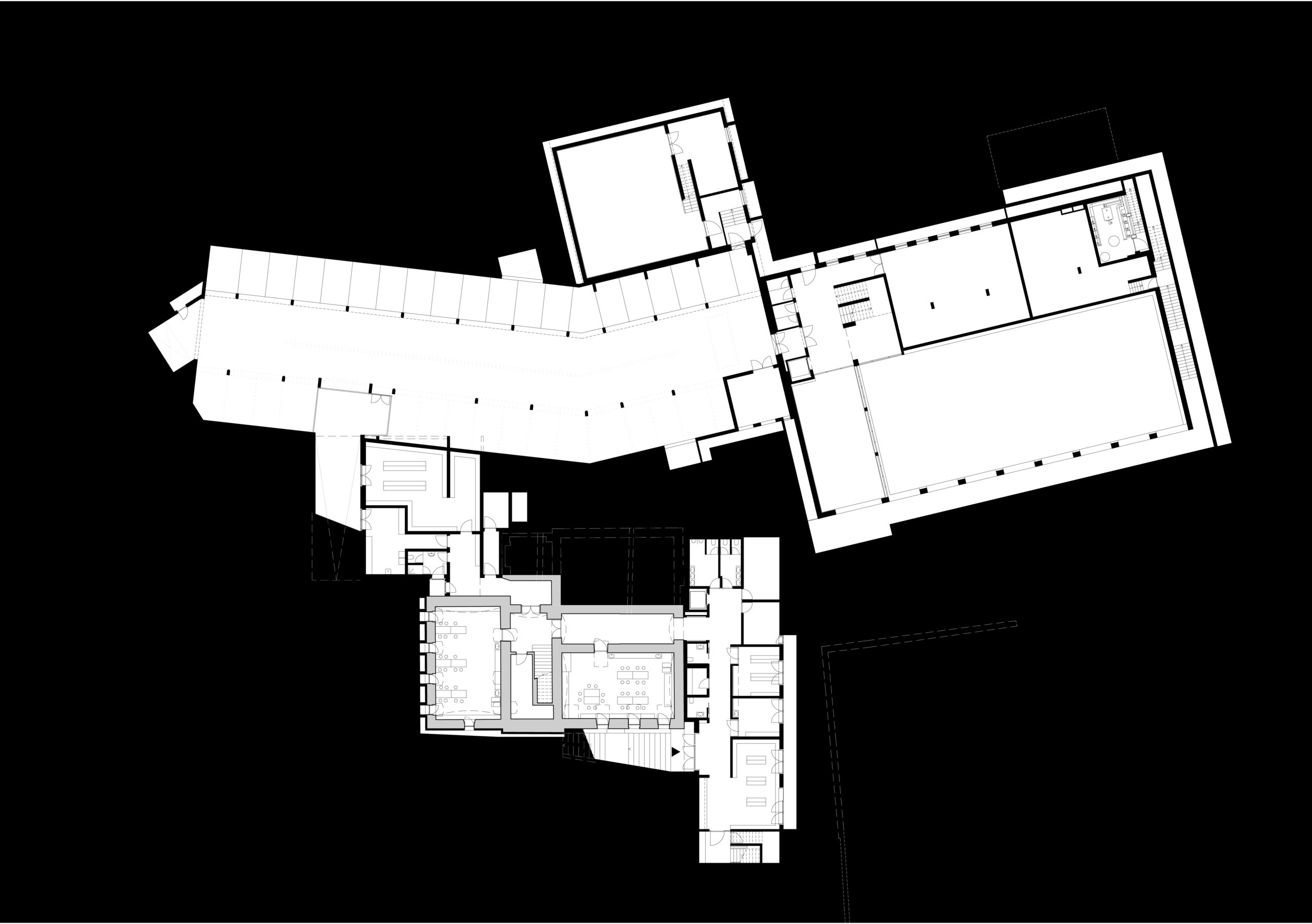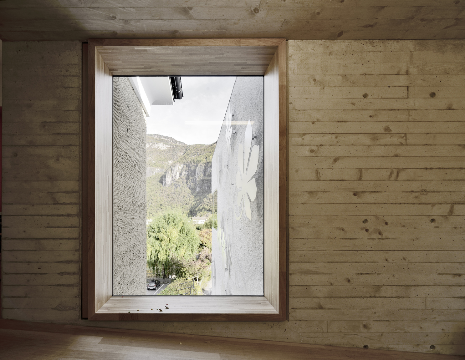 The project integrates the historical building with two new white volumes that frame a centennial chestnut tree, whose natural silhouette is imprinted on both the facades and the interior concrete walls. A fluid, zigzagging corridor connects the three structures, separating the common services on the lower floors from the educational spaces on the upper levels.