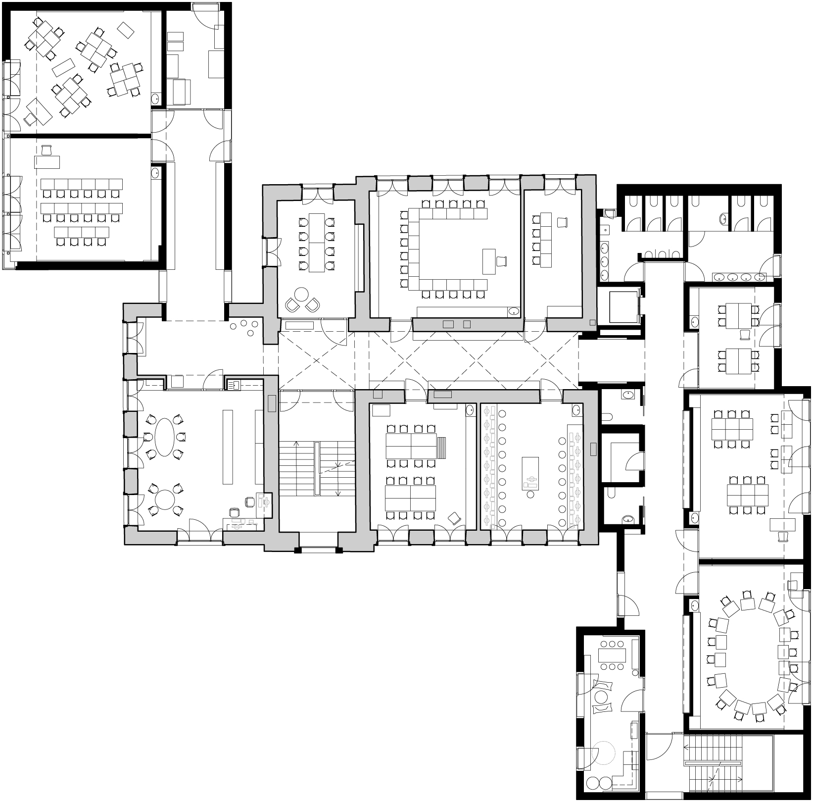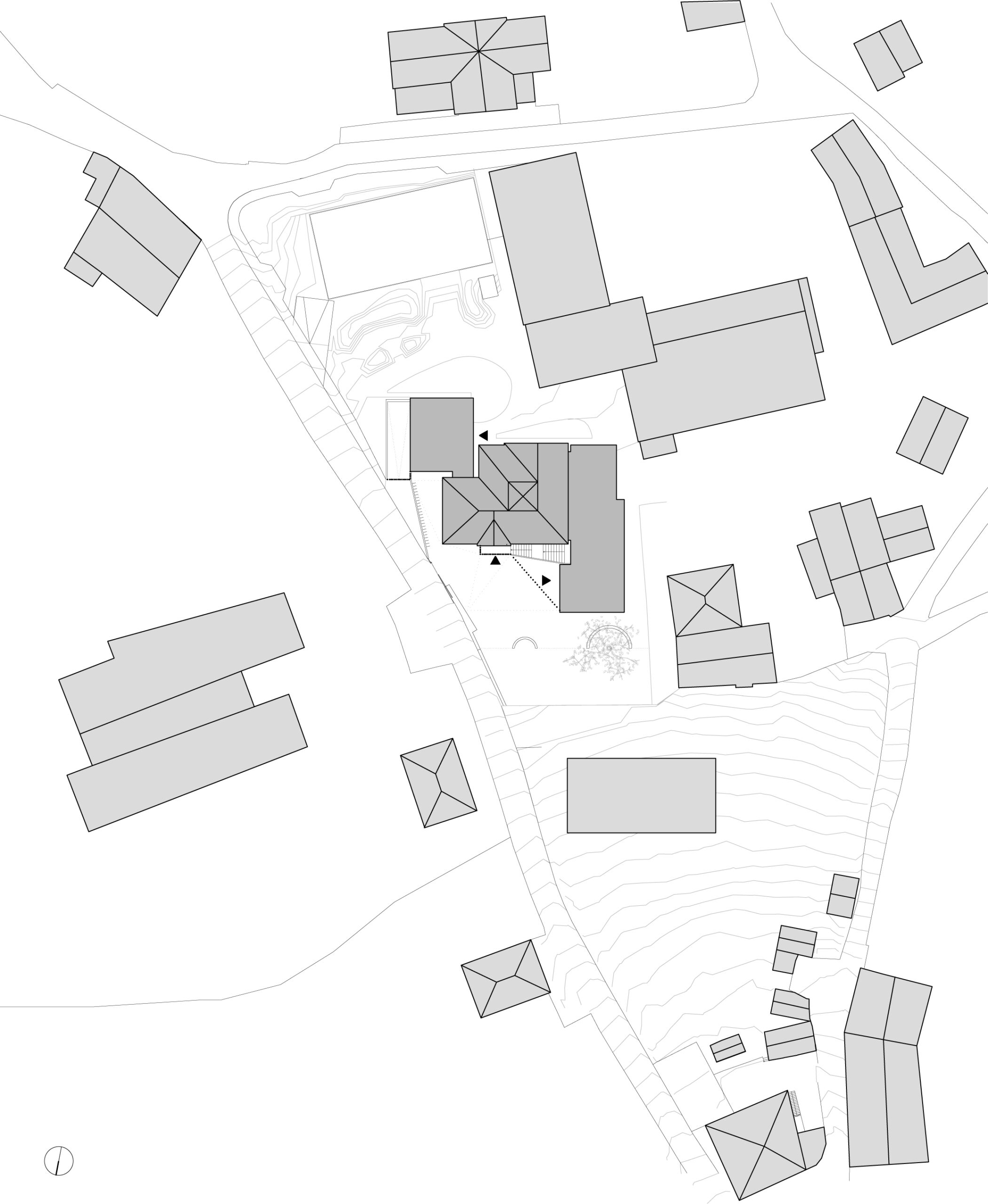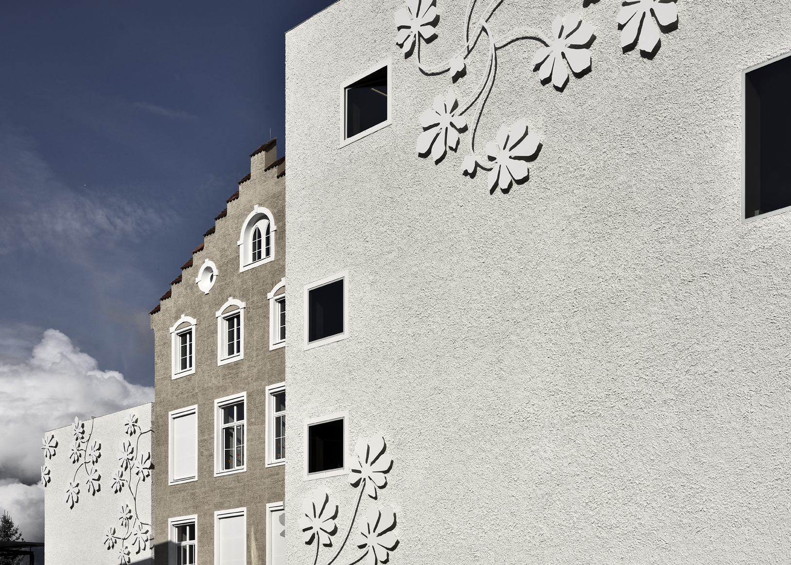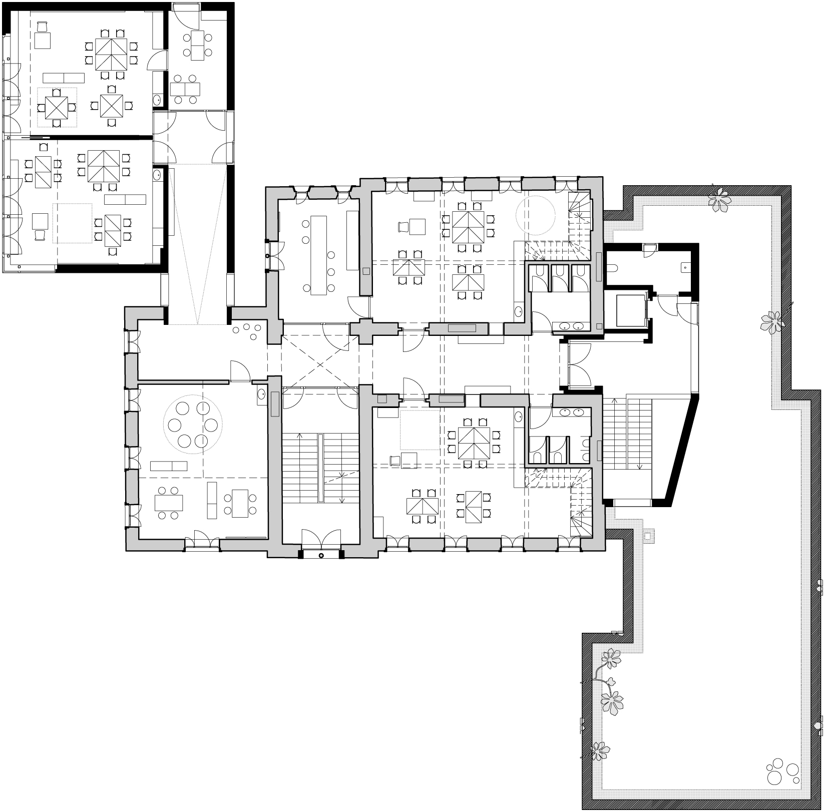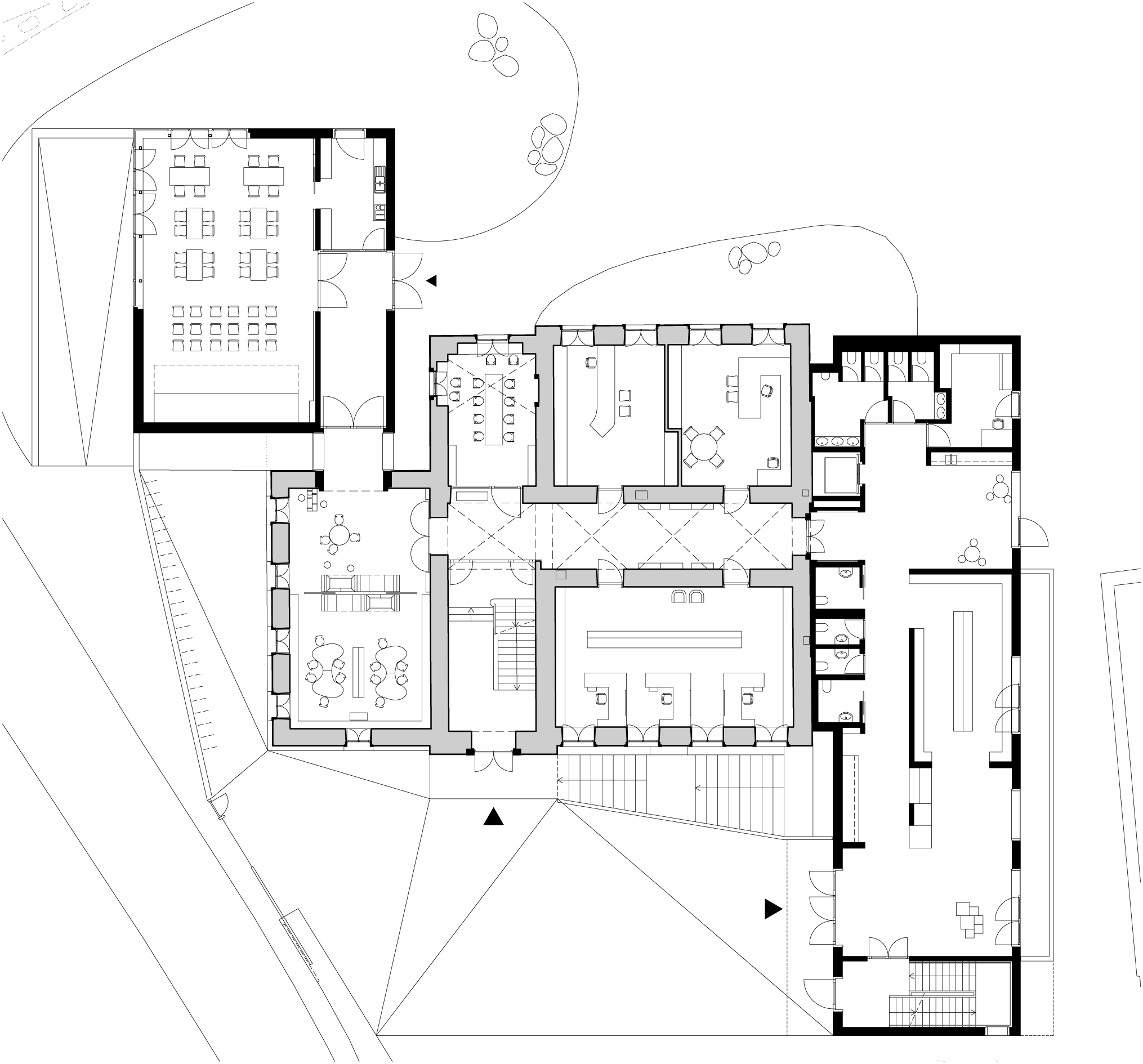 The project integrates the historical building with two new white volumes that frame a centennial chestnut tree, whose natural silhouette is imprinted on both the facades and the interior concrete walls. A fluid, zigzagging corridor connects the three structures, separating the common services on the lower floors from the educational spaces on the upper levels.